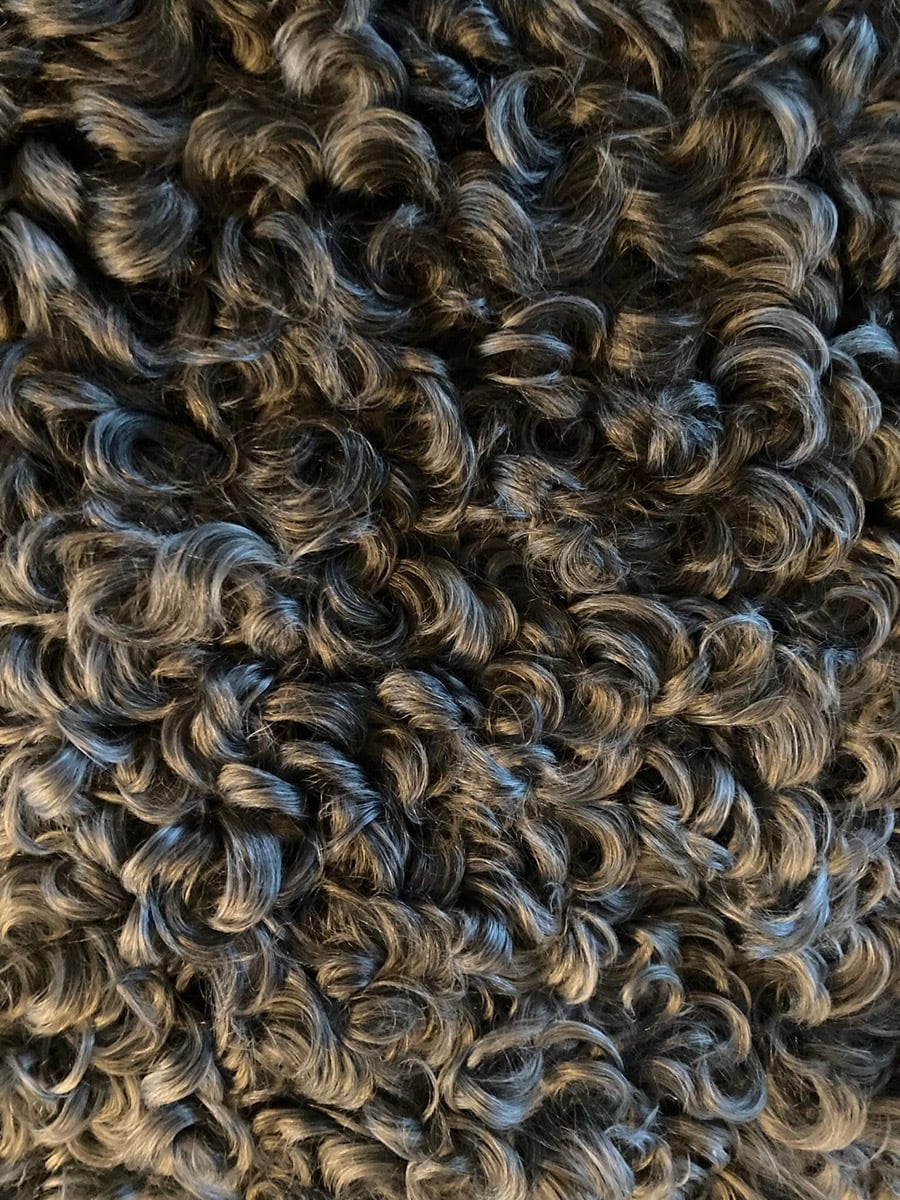 チャコールグレーからライトグレー、オフホワイトまでが一枚の中に共存し、光の当たり方や毛流れによって表情が変わります。